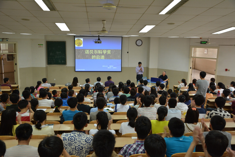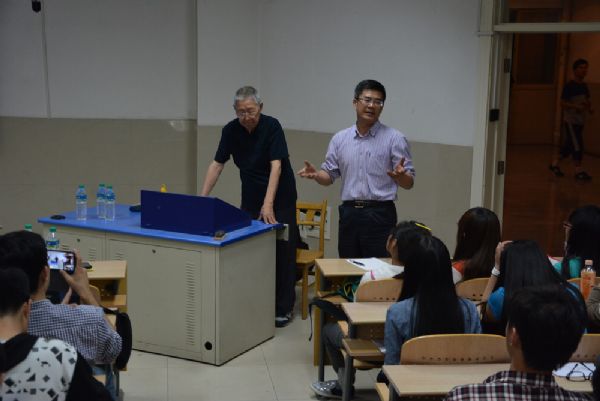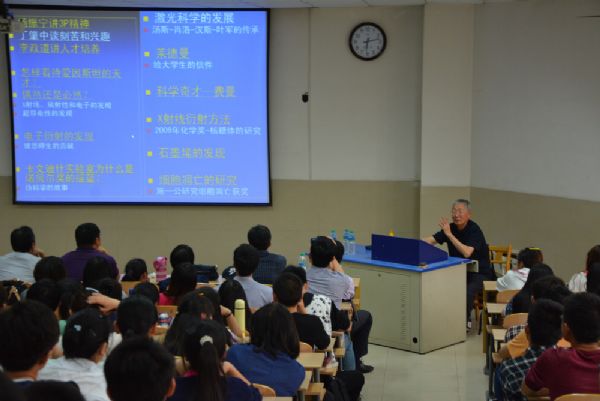 論壇開始之前,學院院長王少清首先對郭奕玲和沈慧君二老作了簡要介紹并表示了誠摯的歡迎。隨后,郭教授通過六個主題,從多個角度闡釋了數十年來在諾貝爾獎方面取得成功的偉大科學家們的個人事跡與成功分析,分別是:實驗自然科學基礎;科學家的情操;機遇與挑戰;個人與團隊;夯實基礎;廣泛的興趣。在報告中郭老談到,諾貝爾獎是現代科學的偉大成就的縮影,折射出現代物理學發展趨勢,希望同學們能夠從這些著名科學家的身上感受到他們為科學事業不求回報,不斷進取的偉大精神,并將這種精神轉化到同學們的日常學習中去,他風趣幽默的口吻及深入淺出的報告贏得了師生們陣陣掌聲與贊嘆。講座期間,郭教授采用了大量圖文資料,并以物理科學發展史為主線,講述了諾貝爾獎獲得者拉比、霍爾、費曼、愛因斯坦、丁肇中以及李政道等人的求學及探索科學的歷程,勉勵同學們要永遠保持一顆好奇心,同時擁有頑強的信念及堅忍不拔的精神。同時用楊振寧的3P精神及施一公的事跡來激發同學們對探索自然科學的興趣。最后,講座進入互動環節,老師與同學們積極提出了疑問,郭教授一一作出了回答。同時,郭教授深情地寄語在場同學,希望大家能有勤奮的態度、創新的精神,不要坐等機遇,要積極尋求、把握機遇。