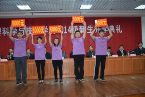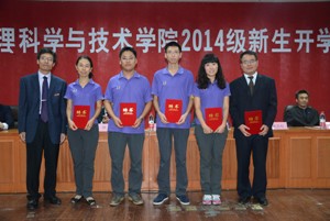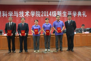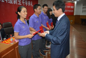 隨后,伴隨著校歌《你我同行》,王少清院長為新生學業(yè)導師頒發(fā)聘書,鄭愛華書記為新生班主任頒發(fā)聘書。為了學分制和學業(yè)導師制的順利實施,每位學業(yè)導師上臺與自己所帶的學生簽訂協(xié)議,使新生們感覺到了學院對他們的愛護和重視。副院長陳剛為今年考上我院研究生的同學頒發(fā)獎金,并勉勵新生們盡快適應(yīng)大學生活,努力學習,爭取有一天自己也站在領(lǐng)獎席上。