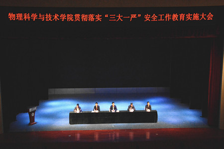 4月21日下午,物理科學(xué)與技術(shù)學(xué)院全體師生齊聚學(xué)校大禮堂,隆重舉行貫徹落實(shí)“大教育、大普查、大整治、嚴(yán)管理”安全工作教育實(shí)施大會(huì)。學(xué)校黨委保衛(wèi)部、武裝部部長(zhǎng)、安全管理處處長(zhǎng)丁立波應(yīng)邀作安全教育報(bào)告,學(xué)院班子成員出席大會(huì)。會(huì)議由學(xué)院副院長(zhǎng)陳剛主持。