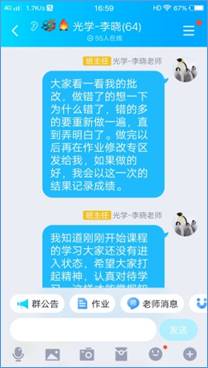 李曉老師本學期承擔的是物理學專業的《光學》課程,該課程在授課過程中需要將幾何光學的作圖過程在線展現給學生。為此,李老師采用了雨課堂與QQ群直播相結合的形式,既利用了雨課堂的預習、彈幕和投稿功能,又利用QQ群直播的屏幕共享彌補了雨課堂不能播放動畫的缺點。此外,由于QQ群課堂沒有直播回放功能,而直播回放是網絡教學的一大優勢,同學們可以通過直播回放進行復習。為了彌補這一不足,李老師在課程直播的同時進行錄屏,每堂課結束以后將錄屏視頻發給學生,以便于復習回看。同學們反響良好,都認為這種授課方式有利于加深知識的學習。