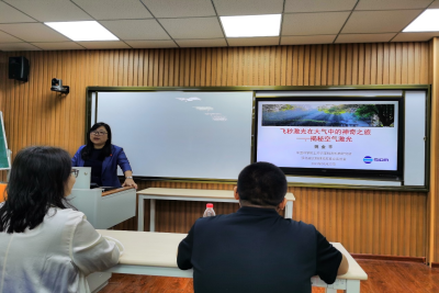 姚金平研究員在報告中介紹了空氣激光現象與機制,并展示其在高靈敏度溫室氣體檢測和同位素分析方面的應用。報告以超強超短激光在空氣中傳播的神奇之旅為開始,深入淺出、生動形象地講解了超強超短激光將空氣轉化為“空氣激光”的過程和機理,介紹了空氣激光在記錄污染物分子信息等領域的研究和應用前沿,最后與現場師生進行了深入廣泛的探討。