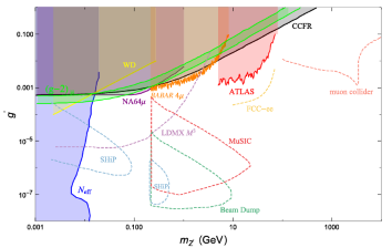 圖1:當前以及未來實驗對U(1)Lμ-Lτ中Z’規范玻色子的限制