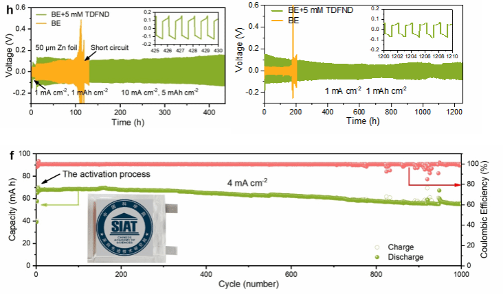 通過高分辨TEM和不同刻蝕深度的XPS表征發(fā)現(xiàn),在空白電解液中引入功能性TDFND不僅可以在Zn電極表面構(gòu)建富含?CF2交聯(lián)網(wǎng)絡(luò)的外層,還可以誘導(dǎo)形成富ZnF2的SEI內(nèi)層。