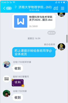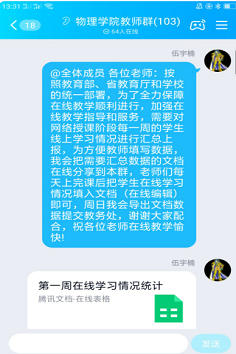 這是一條全力保障之路!為了保障教師們能夠順利開展線上教學,物理科學與技術學院教學管理人員也是全力以赴地做好各項工作。為了有效提升教師在線教學能力,教辦主任伍宇楠老師全力提供線上教學培訓、技術解答、協調服務等保障工作。伍老師深入了解教師的培訓效果和在線教學實際需求,積極聯系傳達學校的各類在線教學平臺提供技術支持,組織學院老師們加入“雨課堂培訓”微信和QQ群、“超星學習通”QQ群、“釘釘在線教學”群等多個在線培訓群,配合學院技術人員做好在線教學咨詢指導和教師相互間的經驗交流工作。為保障在線課程的授課質量,伍老師積極協調、主動服務相關老師更新完善視頻、習題等學習資料。他每日幾乎是全天在線,及時分享在線教學的學習資料、文件,協調各平臺及時解決教師的問題。