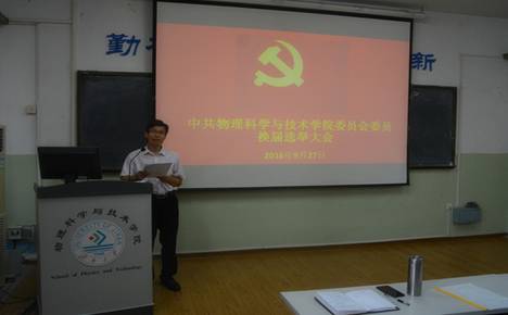 2016年9月27日下午,物理科學與技術學院黨委在學院會議室召開了委員換屆選舉大會,會議由陳剛副院長主持,學院黨委上屆委員、全體教工中國共產黨員和學生中國共產黨員共計86人出席了會議。