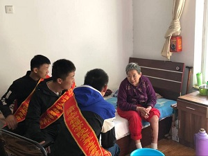志愿者們佩戴著鮮艷的綬帶,左肩右挎、左高右低,綬帶覆蓋住了心的部位,表達了他們的正心誠意。同學們不辭辛勞,包攬了公寓內部分區域的衛生工作:用干凈的濕布擦拭老人們的房門、窗戶、桌椅和老人們平時要扶著行走的不銹鋼欄桿等物件;用拖布拖了老人們房間內的木質地板和走廊內的石質地板;為老人們整理房間等。
