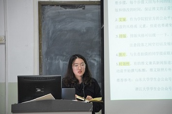 本期培訓會主要分為寫作、攝影、后期、推送四大方面,基本涵蓋了新聞工作的各個環節,覆蓋全面,有針對性。寫作方面首先由青年通訊社采編部部長席曉婕同學為大家介紹了新聞稿件的投稿注意事項及基本寫法,隨后化學學院新聞網絡中心的白楊同學以優秀稿件為案例,詳盡細致地為大家介紹了不同類型寫作的注意事項;攝影方面由新生輔導員伊夢寒老師為大家講解了如何使用相機、畫面的基本構圖方式以及運用光與影的技巧去拍出精美照片的方法,同時幻坊動漫社的王嘉瑋同學也從自身人像攝影的經驗談起,為到場同學講述了不同場景下調節相機的方法;校學生會宣傳部部長盆鑫雨同學從公眾號建設經驗談起,詳細的為大家講述了一篇好推送的制作過程和注意事項,為大家講解了PS的一些常用快捷鍵,并現場演示了利用PS對照片進行后期處理的方法。最后,新聞宣傳中心指導教師弋媛老師對培訓大會作出了總結,對受邀進行講授的老師和同學們表達了感謝,同時她也寄語到場同學要始終堅守新聞人的初心,用愛和責任做好學院的新聞宣傳工作。