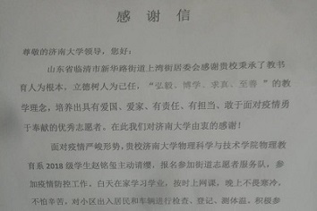 烏云遮不住升起的太陽,疫情擋不住春天的來臨。7月15日,濟南大學物理科學與技術學院收到一封來自“臨清市新華路街上灣街居委會疫情防控指揮部”的感謝信,感謝我校培養出愛國、愛家、有責任、勇于面對疫情、勇于奉獻的優秀志愿者,感謝濟南大學物理科學與技術學院物理教育系2018級學生趙銘璽同學疫情期間為當地防疫工作做出的貢獻。