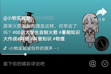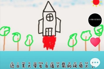 視頻制作之前,小物科普志愿服務隊在網絡上查詢了與火箭有關的專業知識,對其語言進行通俗化、卡通化,并將其編排為一部小情景劇視頻,反復推敲語言。視頻首先介紹了劉上同學所制作的固體火箭,通過簡單的畫圖,將火箭的運行原理表現出來,圖象簡單易懂,符合小朋友們的認知能力,通過舉例子:子彈的后坐力、滑冰推人時的相互滑動,將火箭運動定律——牛頓的第三運動定律清清楚楚的介紹給小朋友們。視頻一經放出,評論區便展開了討論,有的家長表示自己的孩子通過學習對火箭的原理已經較為了解,還有小朋友在評論區補充更多的相互作用力的例子。