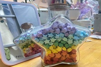 這么多紙星星,是由物理學院青年志愿者協會提前召集20名志愿者折疊的,并且每數好520顆彩色的小星星裝滿一只星星瓶,每一顆紙星星都包含了志愿者們對小朋友們的愛心和祝福,信望愛殘疾人服務中心的負責人對志愿者們的到來表示感謝,并介紹了信望愛殘疾人服務中心里孩子們的近況。志愿者們參觀了殘疾中心小朋友們學習、吃飯的地方,同孩子們一起交流。看到孩子們收到愛心星星瓶時臉上露出的燦爛笑容,志愿者們心中也感到無比欣慰。